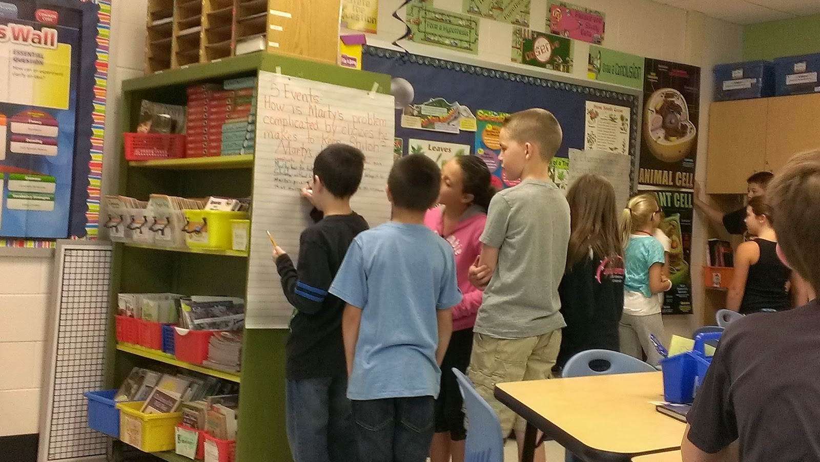 For the last several years Dayton Avenue School has worked with nationally recognized school consultant Judy Dodge in the implementation of differentiated instructional strategies. Recently, in Mrs. Smith's Readers Workshop students completed a carousel activity. The goal of the activity is for small groups of students to move around the room, working collaboratively, to answer questions related to the lesson. This instructional strategy provides the opportunity for each subsequent group to build on the knowledge of the previous group. Furthermore, this activity creates a meaningful classroom experience that deepens student understanding of content and promotes teamwork.